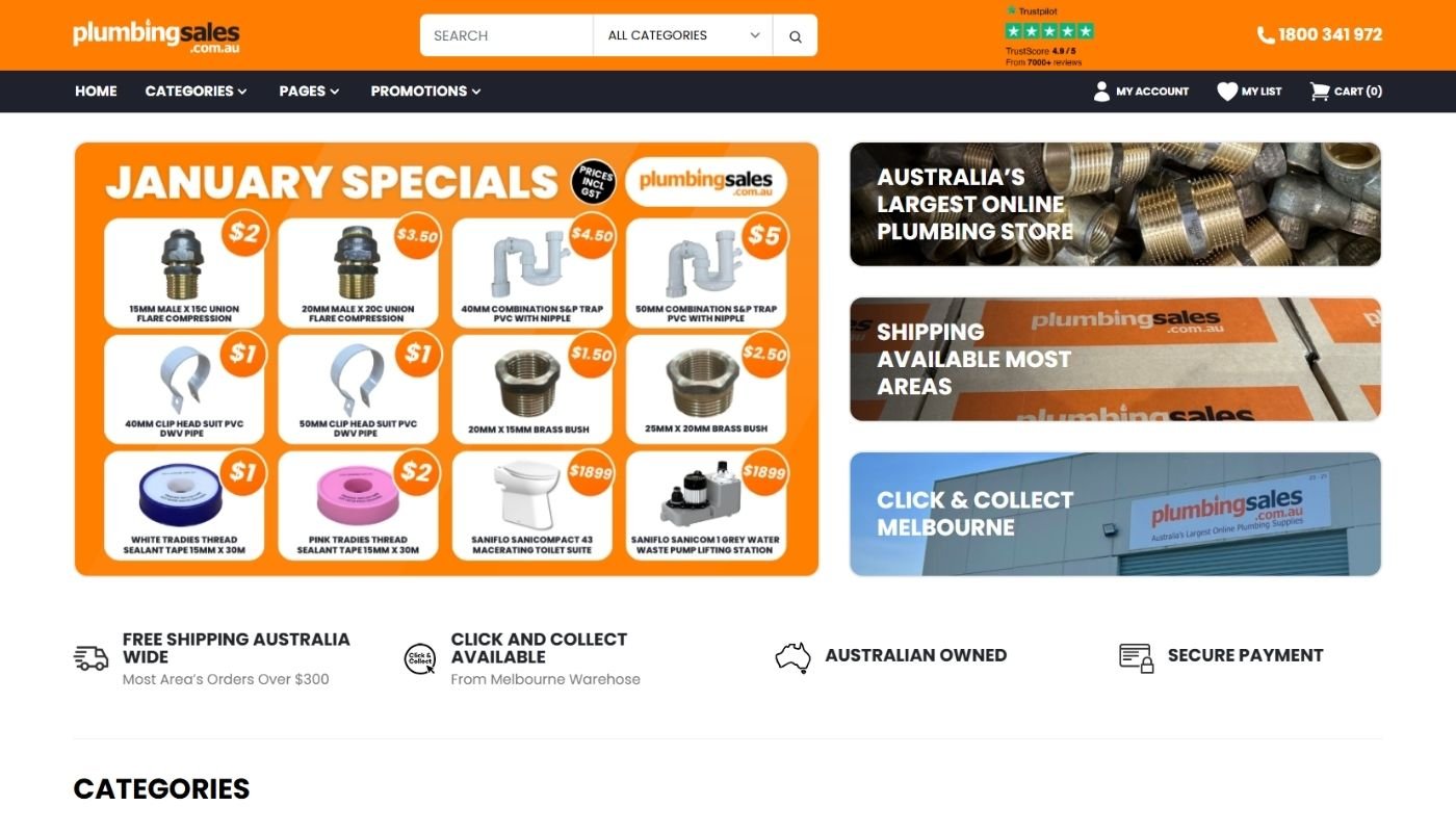 We delivered a strategic e-commerce website design that positions PlumbingSales Australia as a leading online plumbing supply store, clearly displays categories and products, and encourages visitors to purchase, request quotes, or collect items.