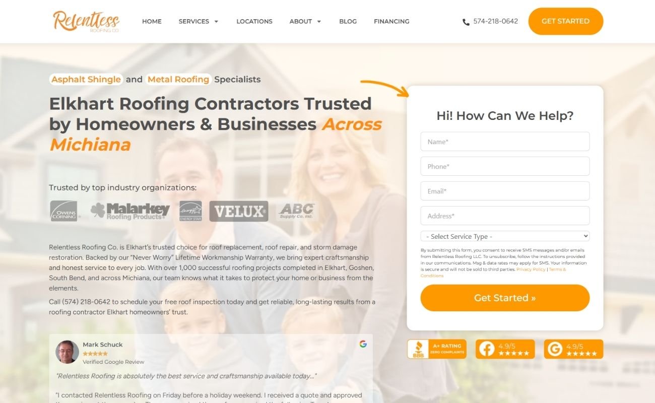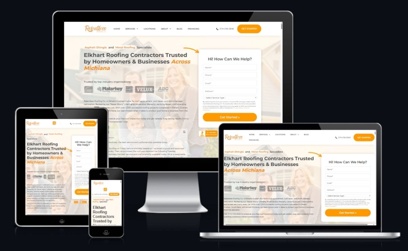Relentless Roofing Co. needed a professional online presence that accurately reflected its reputation as a trusted roofing contractor in Elkhart and the greater Michiana area. The company offers a wide range of roofing services — from replacements and repairs to storm damage restoration and insurance claim support — and needed a website that clearly organized this expertise, highlighted its strong track record, and encouraged visitors to request inspections, estimates, or consultations.
