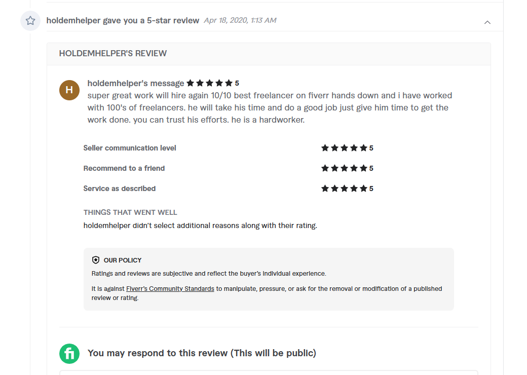 super great work will hire again 10/10 best freelancer on fiverr hands down and i have worked with 100's of freelancers. he will take his time and do a good job just give him time to get the work done. you can trust his efforts. he is a hardworker.