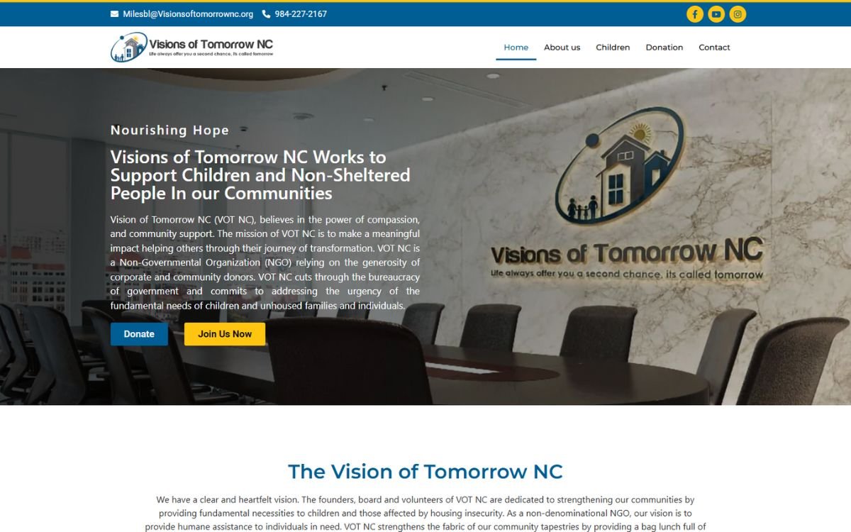Visions of Tomorrow NC needed a website that clearly communicates its mission — supporting children in underserved communities, people experiencing housing insecurity, and those re-entering society after incarceration. The existing site had challenges: